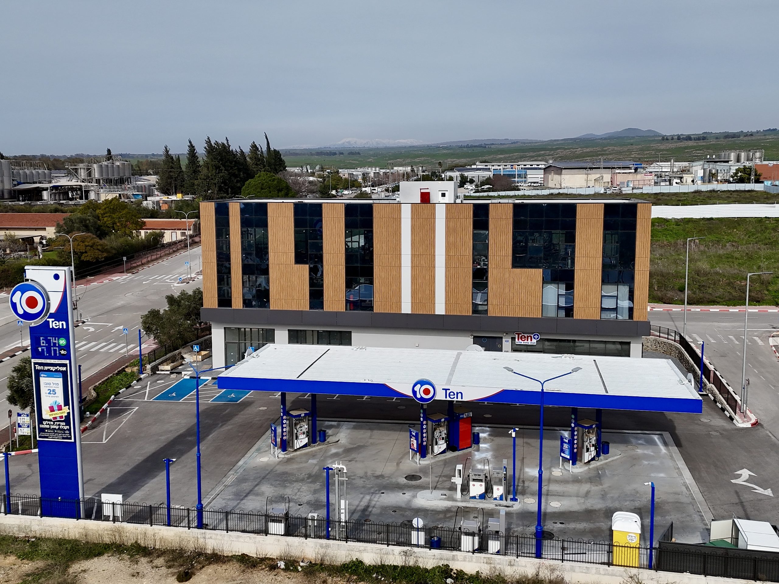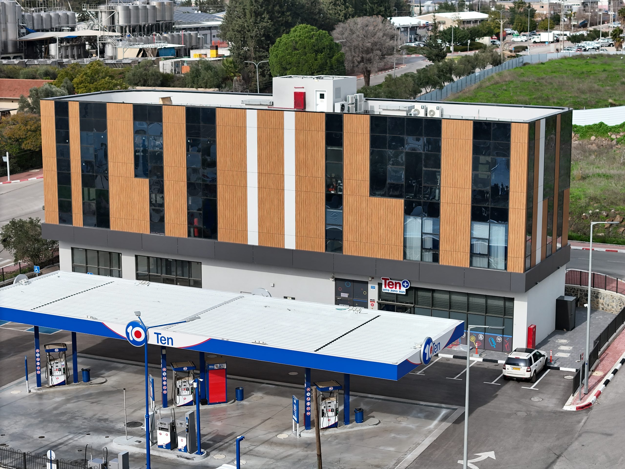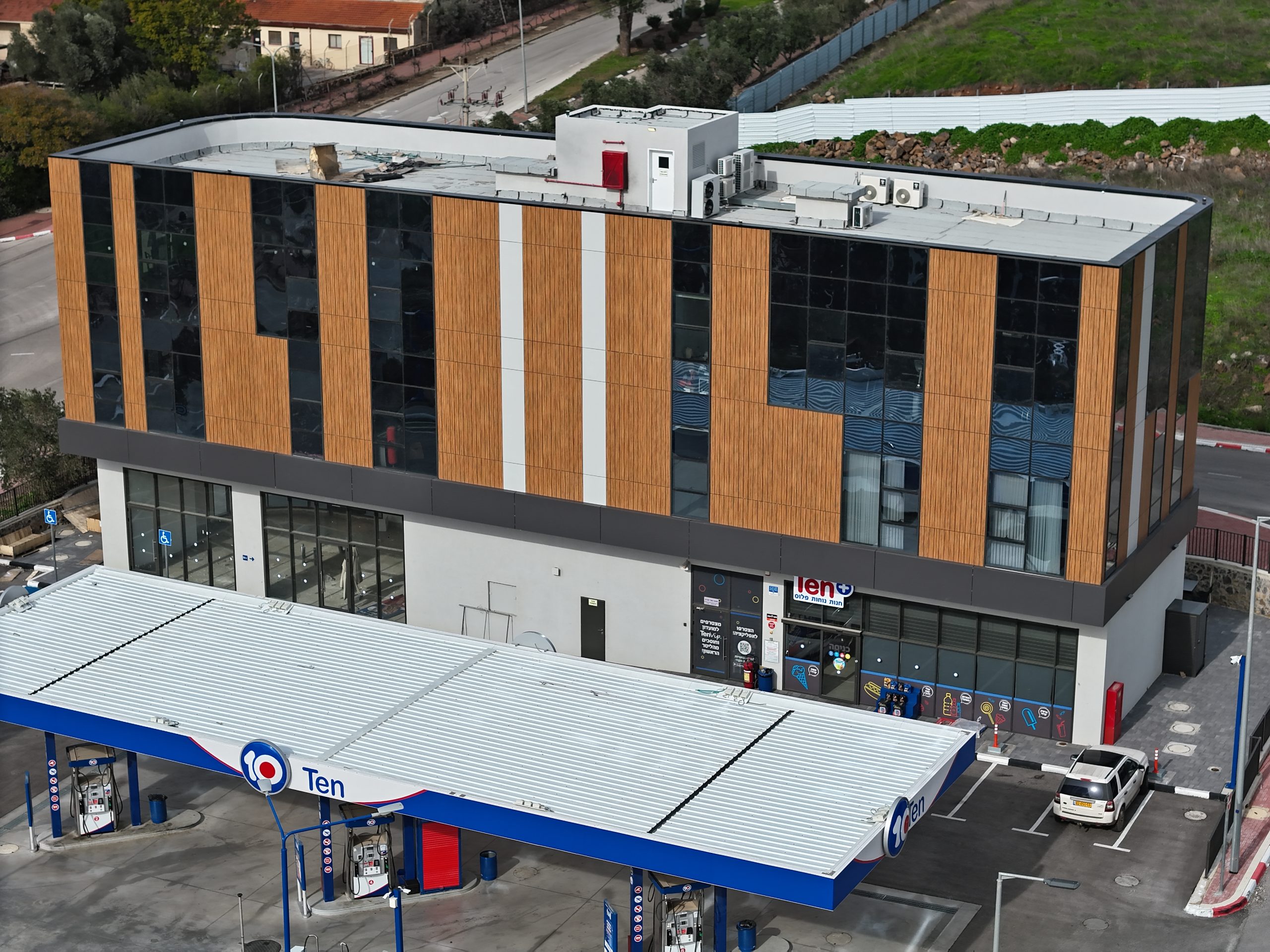 חיפוי אריחי HPL למבנה משרדים בן שתי קומות, בתחנת דלק טן בקצרין.