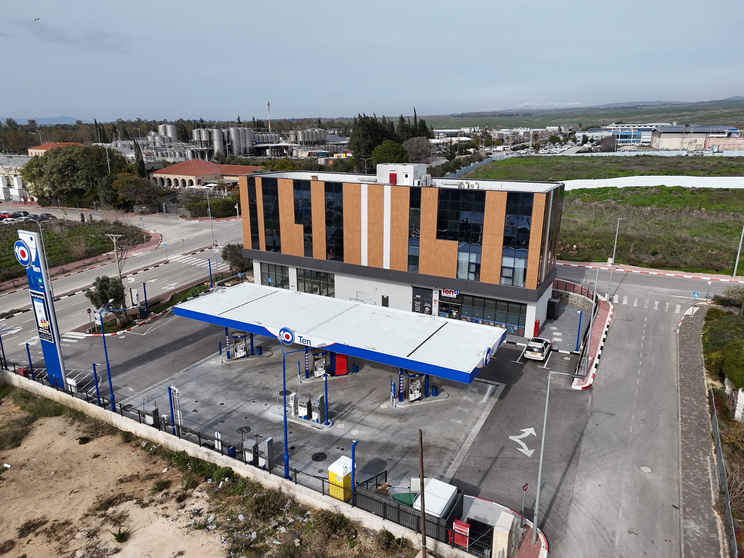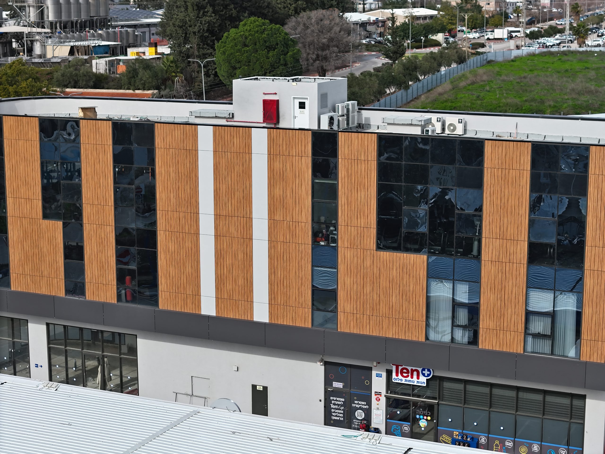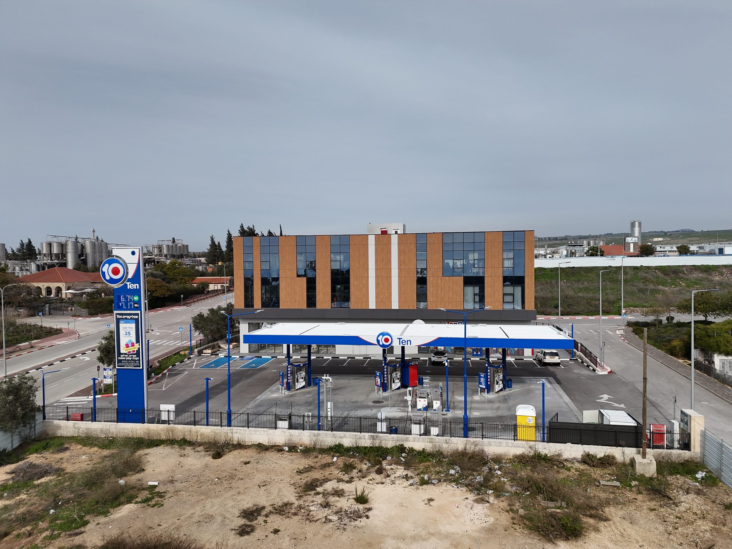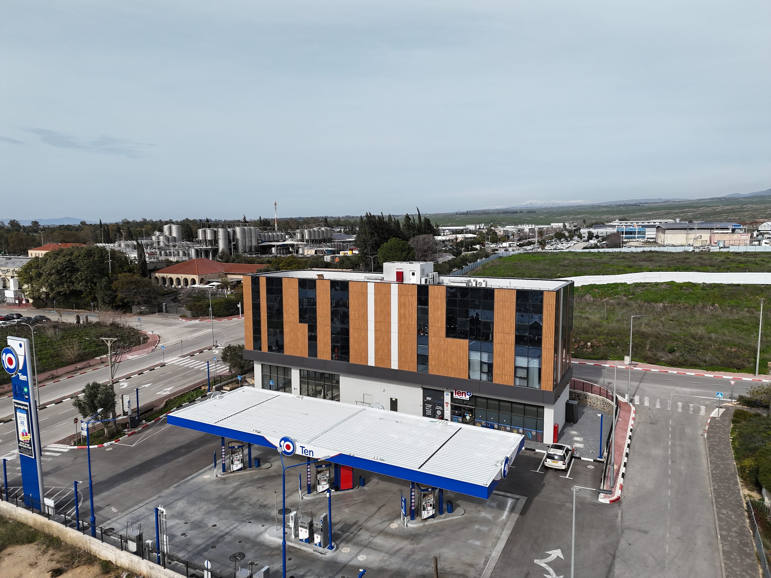 חיפוי אריחי HPL למבנה משרדים בן שתי קומות, בתחנת דלק טן בקצרין.